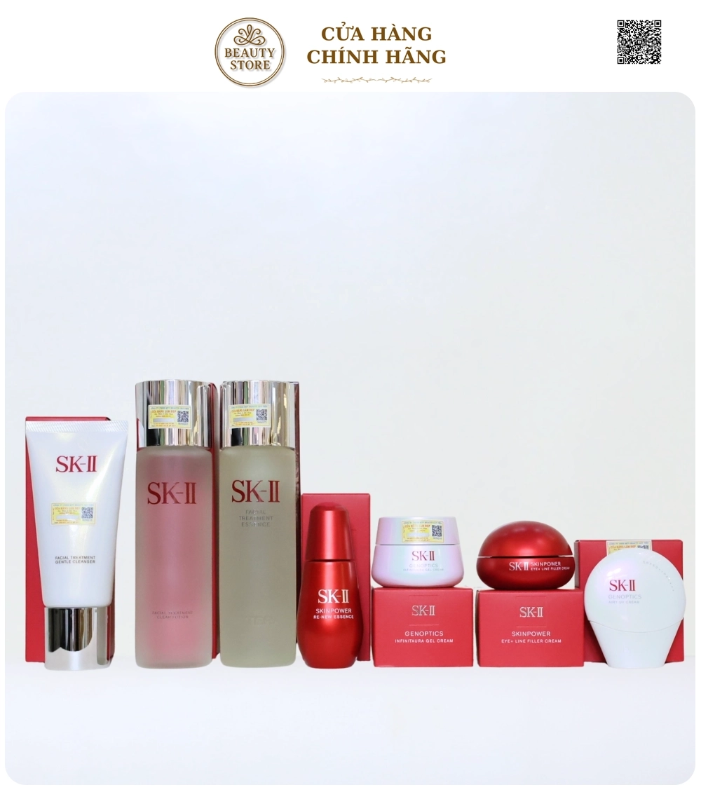 Bộ 7 món cao cấp từ SK-II là chu trình chăm sóc da toàn diện từ làm sạch – dưỡng sâu – trẻ hóa – dưỡng sáng – bảo vệ da ban ngày. Sự kết hợp giữa SkinPower Re-New Essence (chống lão hóa, tăng đàn hồi) và GenOptics Infinitaura Gel Cream (dưỡng sáng, cấp ẩm) giúp mang lại hiệu quả kép: da săn chắc hơn – sáng hơn – mịn màng hơn rõ rệt.