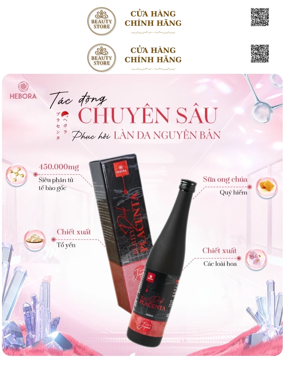 - Chính thức lộ diện siêu phẩm mới nhất, nước uống Tinh Chất Tế Bào nhau thai Hebora Nhật Bản – Beauty Drink Placenta, với chiết xuất từ Tinh Chất Tế Bào nhau thai heo với hàm lượng cao 450.000mg và tinh khiết hàng đầu thị trường, cùng chiết xuất tổ yến, Co-enzyme Q10 và nhiều thành phần thiên nhiên khác, Nước Uống Nhau Thai Hebora Beauty Drink Placenta không những mang đến khả năng hỗ trợ làm đẹp da mà còn giúp bổ sung dưỡng chất giúp duy trì làn da khỏe mạnh cho người sử dụng.