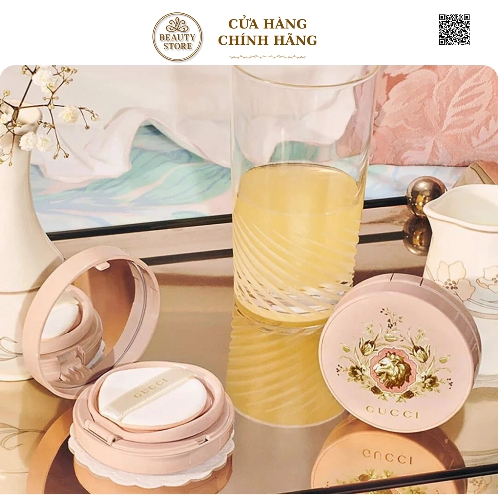 Gucci Beauty Cushion với công thức SPF 22/PA ++, đặc tính chống ô nhiễm và chống ánh sáng xanh giúp bảo vệ da khỏi ánh nắng mặt trời và các tác nhân bên ngoài khác và tăng cường dưỡng ẩm suốt cả ngày. Công thức cũng có lipochrome, chiết xuất từ dầu hoa hồng đen mang lại vẻ tự nhiên và mịn màng cho làn da.