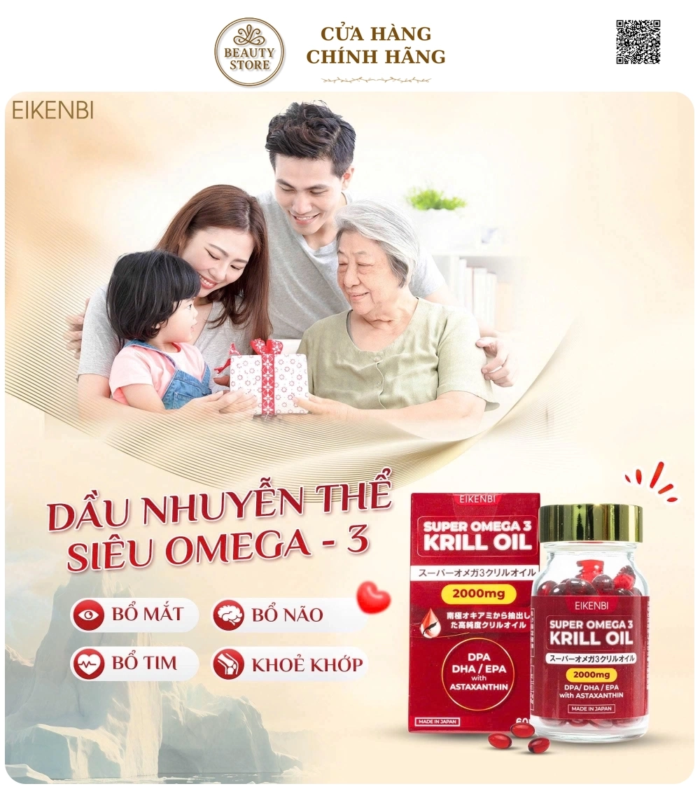 Combo 3 Hộp Viên Uống Dầu Nhuyễn Thể Eikenbi Super Omega 3 Krill Oil 2000mg Từ Nhật Bản Hộp 60 Viên